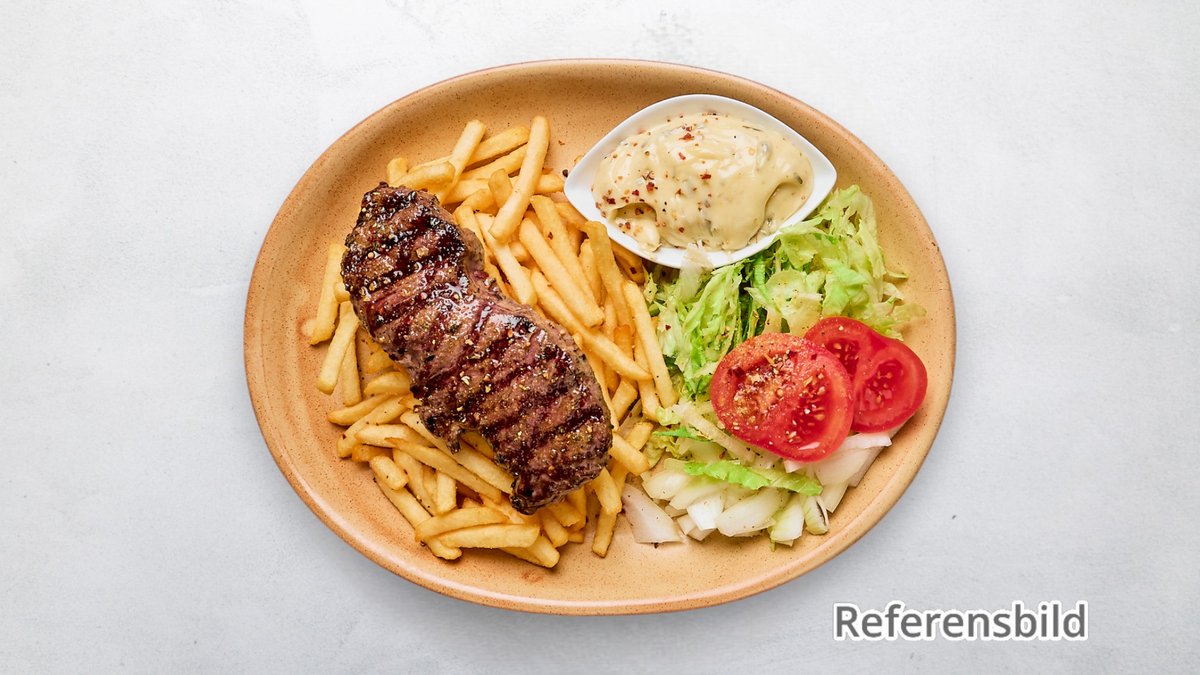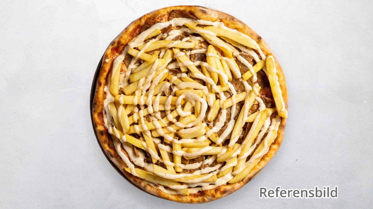 Tomatsås, ost, creme fraishe. oxfilé, kebab, champinjoner, lök, bea, vitlökssås och pommes.