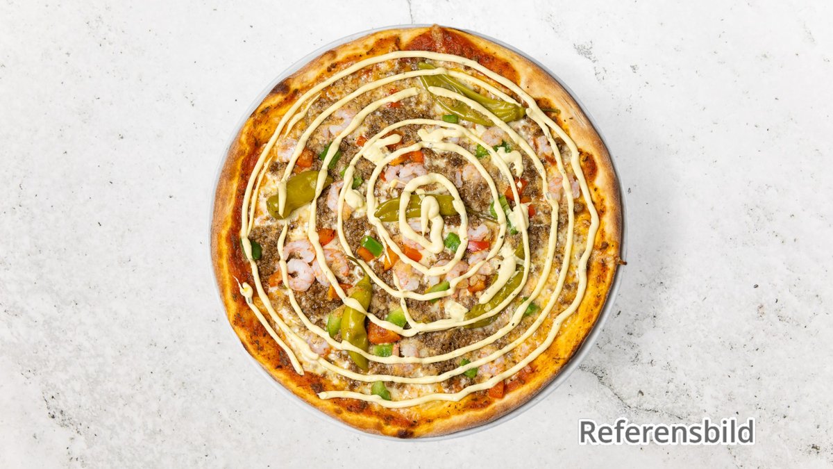 Tomatsås, ost, fläskfilé, salami, tacofärs, räkor, champinjoner och vitlökssås.