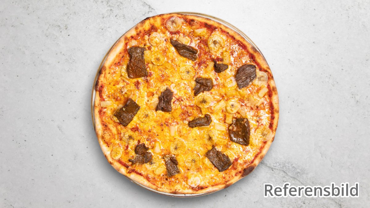 Tomatsås, ost, skinka, ananas, banan och curry.