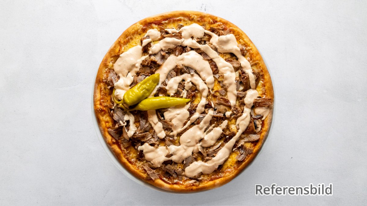 Tomatsås, ost, kebab, lök, peperoni, paprika, tomat och kebabsås.