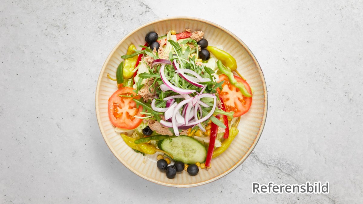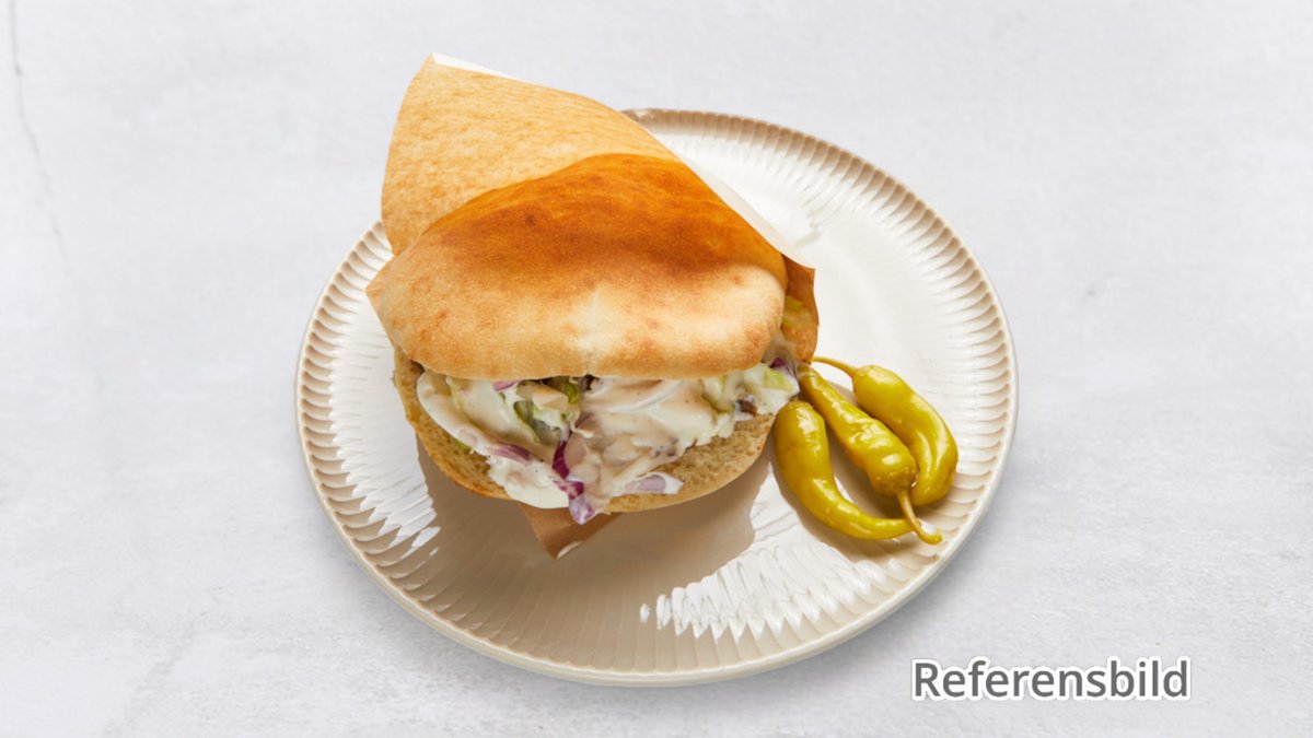 Tonfisk, kebabsås mild, gurka, isbergssallad, tomater, paprika och rödlök.