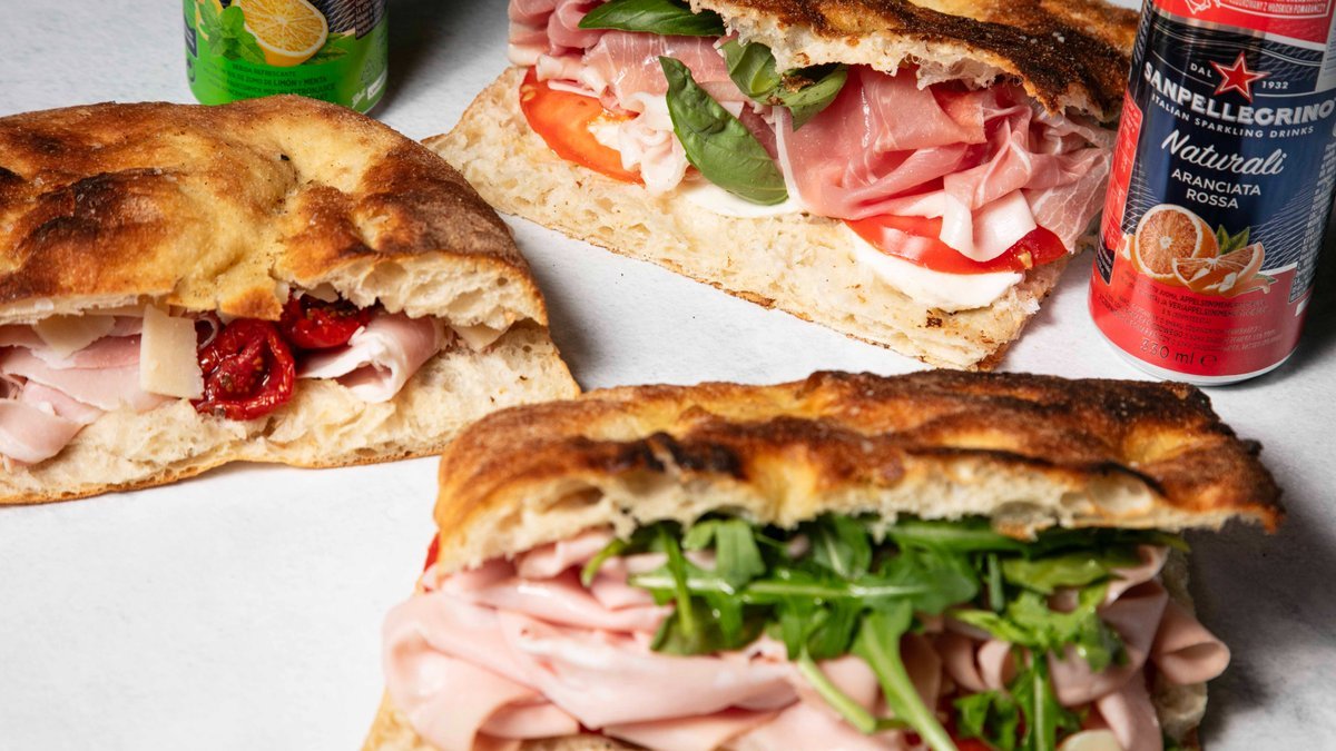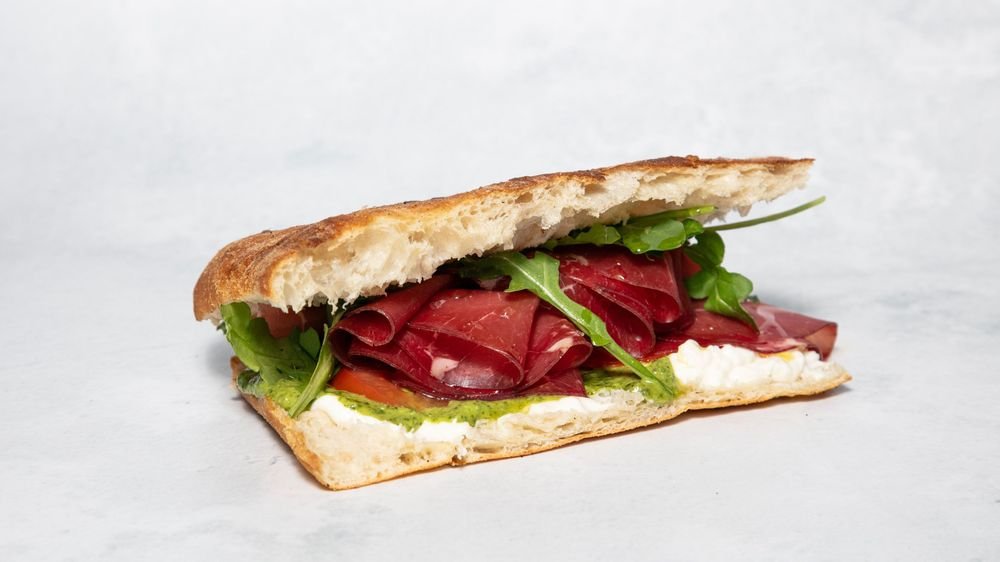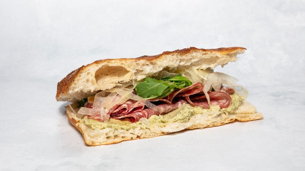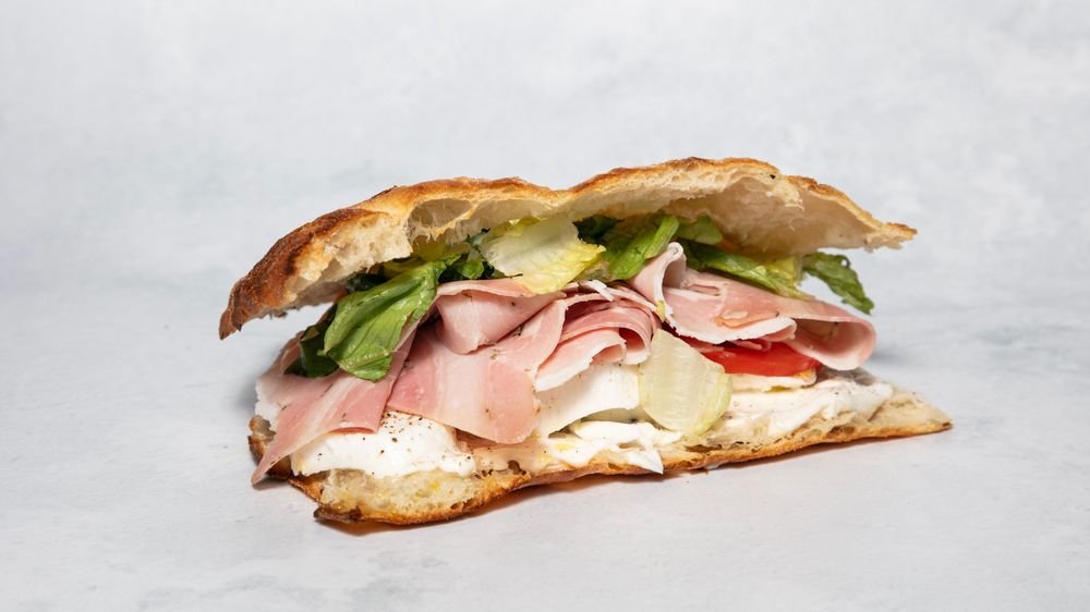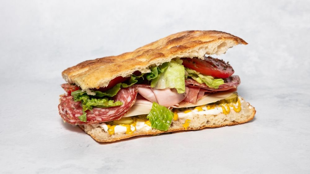 Mortadella, prosciutto, salami, kalkopastrami, provolone, pickles, majonnäs, amerikansk senap, bifftomat, romansallad, oregano, rödvinsvinäger