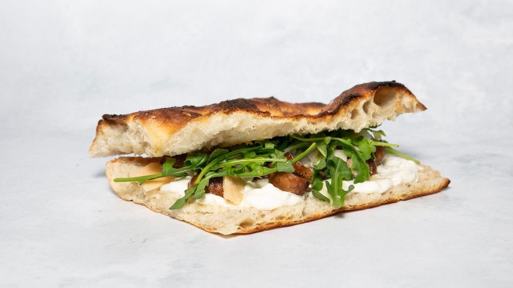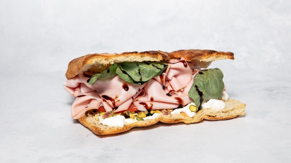 Mortadella, stracciatella, pistagenötter, basilika, bifftomat, balsamico.