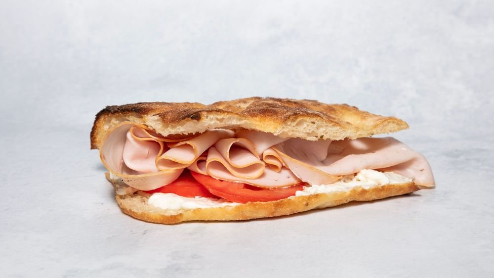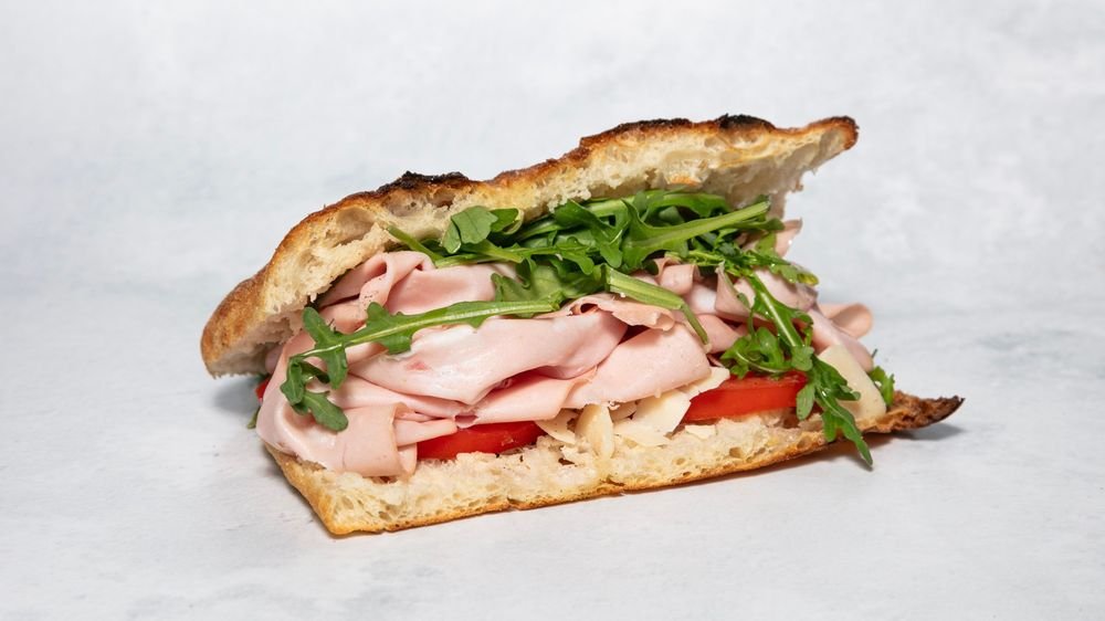 Mortadella, prosciutto, salami, kalkopastrami, provolone, majonnäs, amerikansk senap, bifftomat, romansallad, oregano, rödvinsvinäger