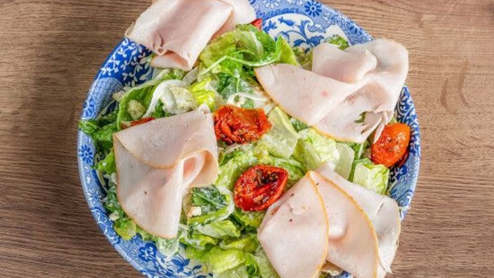 Signatursallad med krämig dressing, kalkonpastrami, semitorkad tomat, krutonger