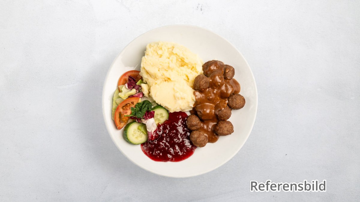 Med gräddsås, rårörda lingon, pressgurka och hemlagat potatismos.