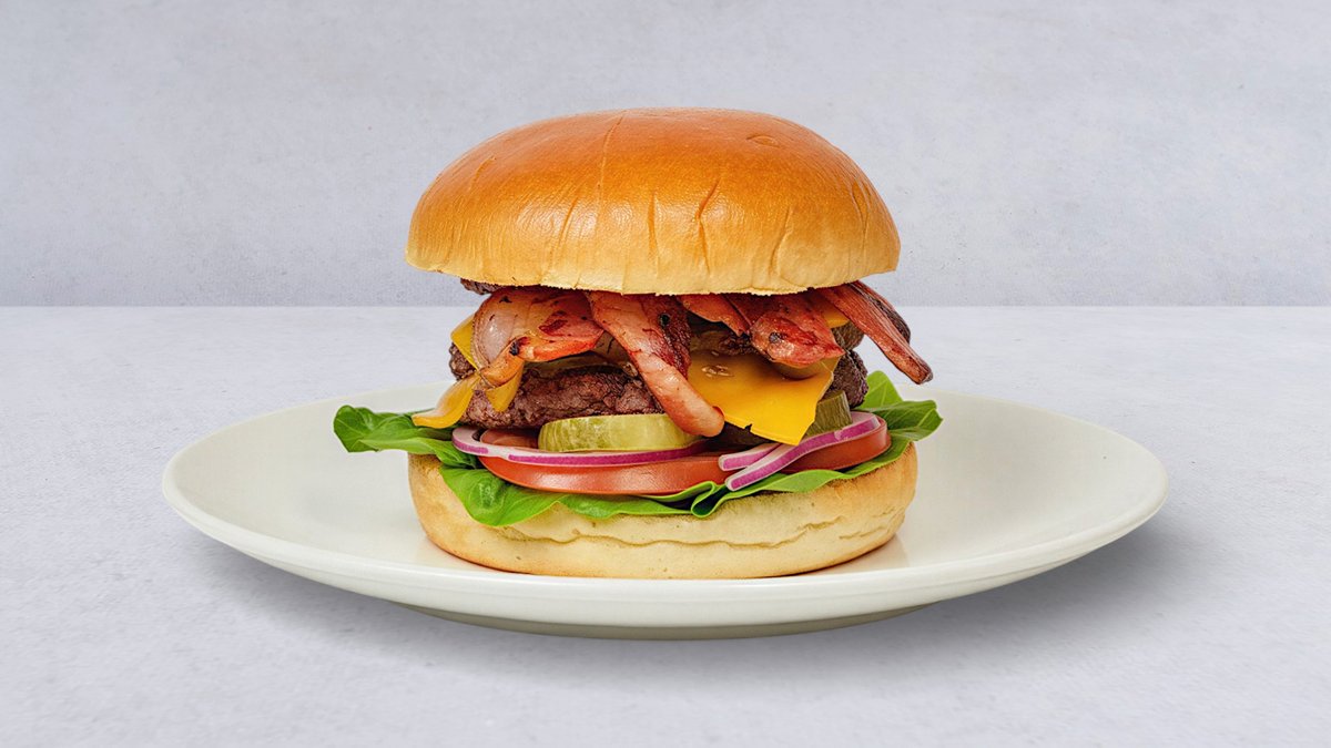 Hamburgare med bacon, ost, sallad, gurka, tomater, lök, rostad lök, chilimajonnäs och BBQ-sås. Välj storlek och serveringssätt i nästa steg.