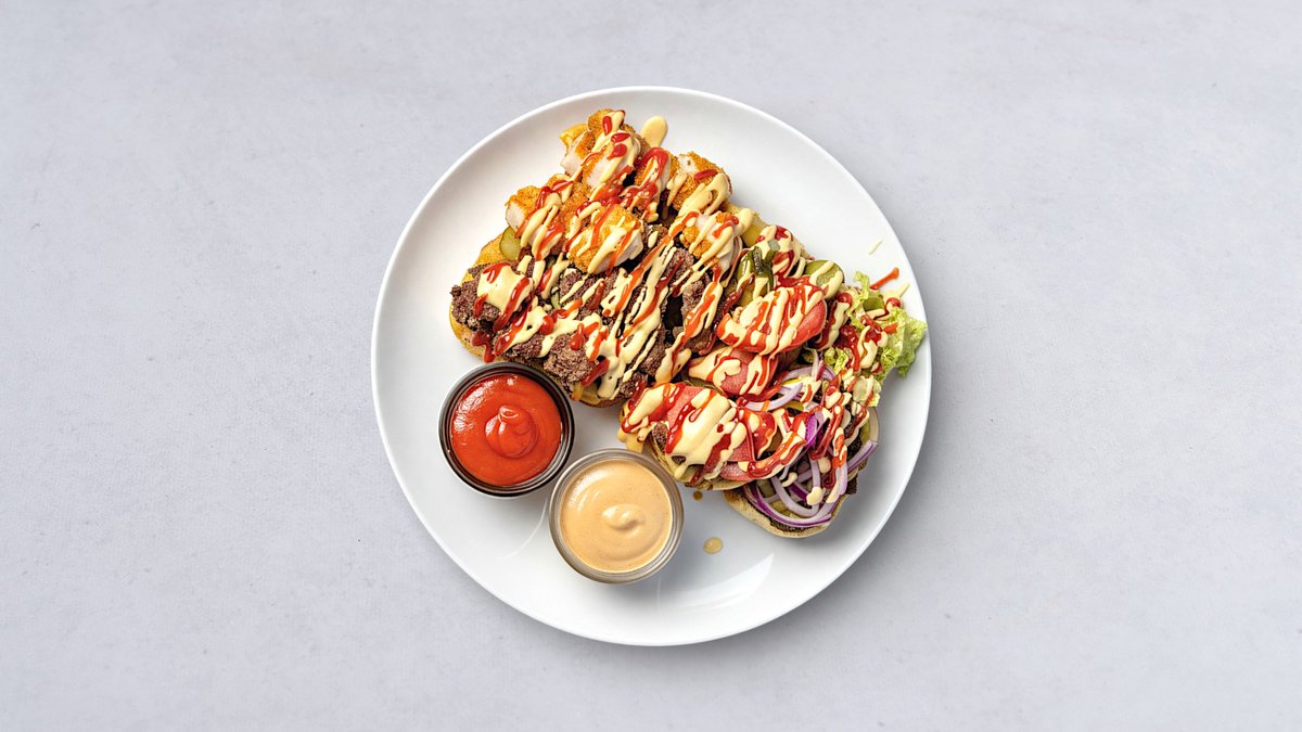 Chili mayo, BBQ sauce, Bacon, Roasted onions, pickled cucumbers, Cheese, Salad, Tomato & onions.