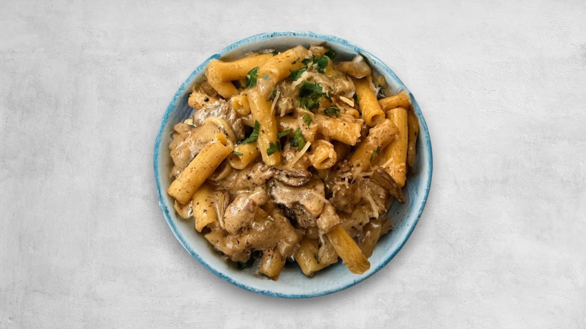 Rigatoni i grädde med Portobellosvamp, rucola och färskriven parmigiano.