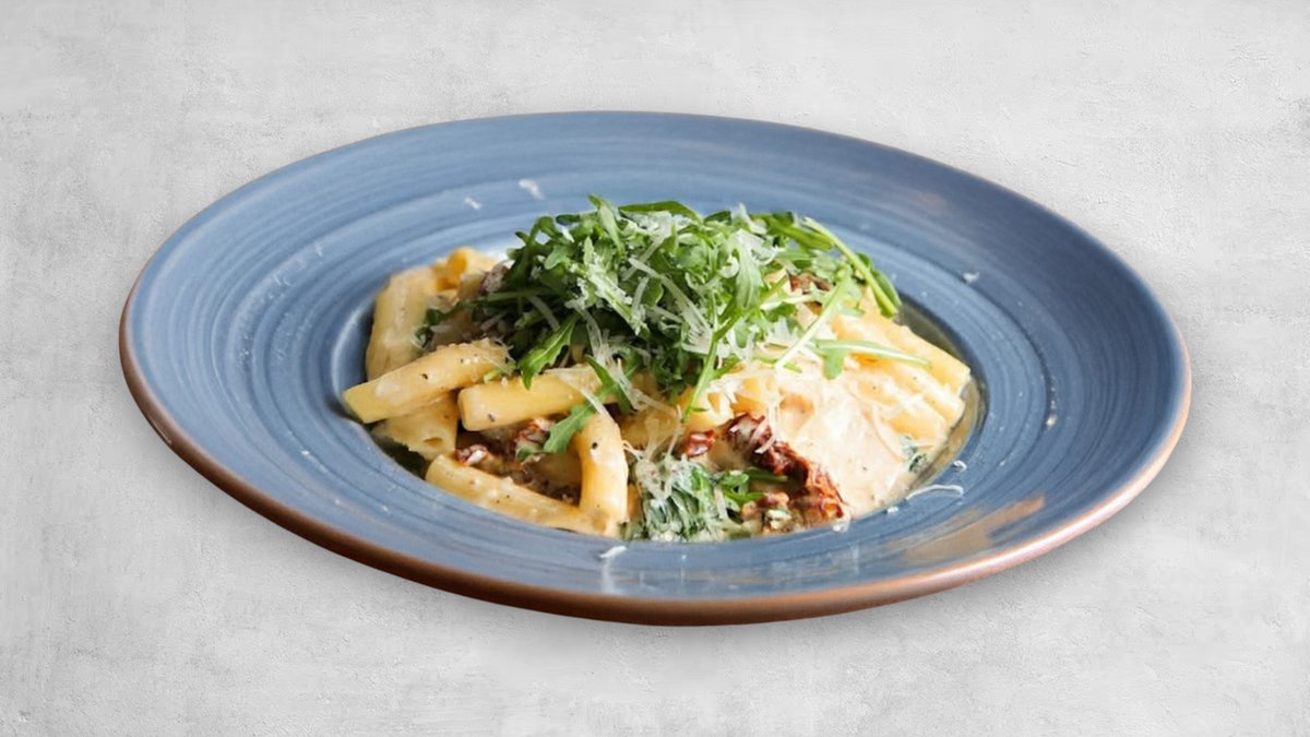 Rigatoni i gräddig sås med tärnad kycklingfilé, babyspenat, Taleggio & soltorkade tomater