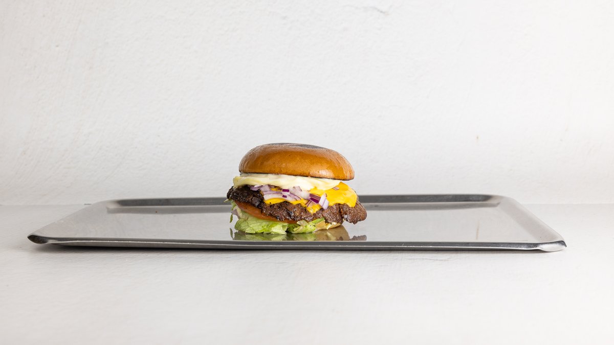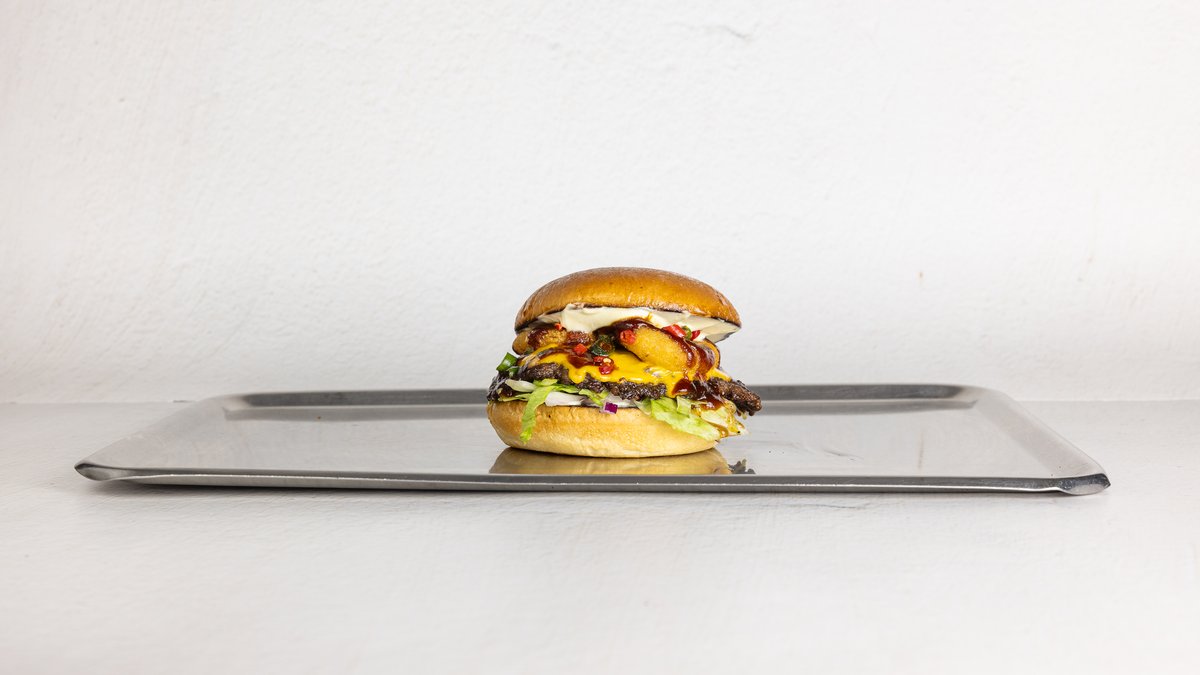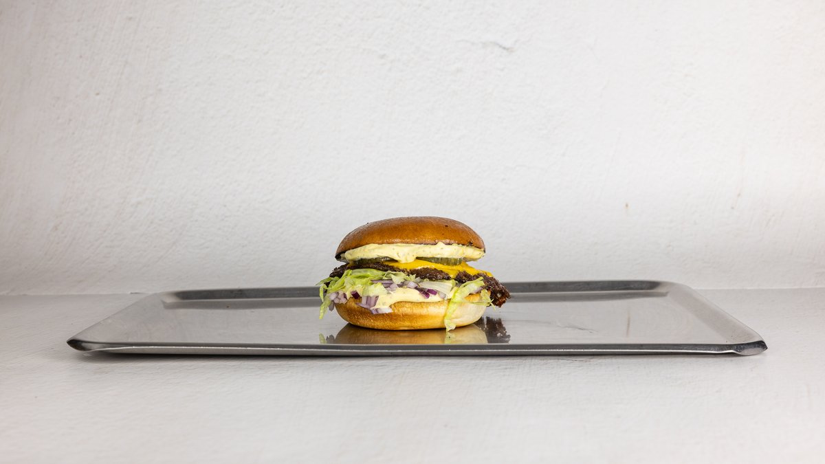Cheddarost, beasås, rostad lök, saltgurka och mer beasås.