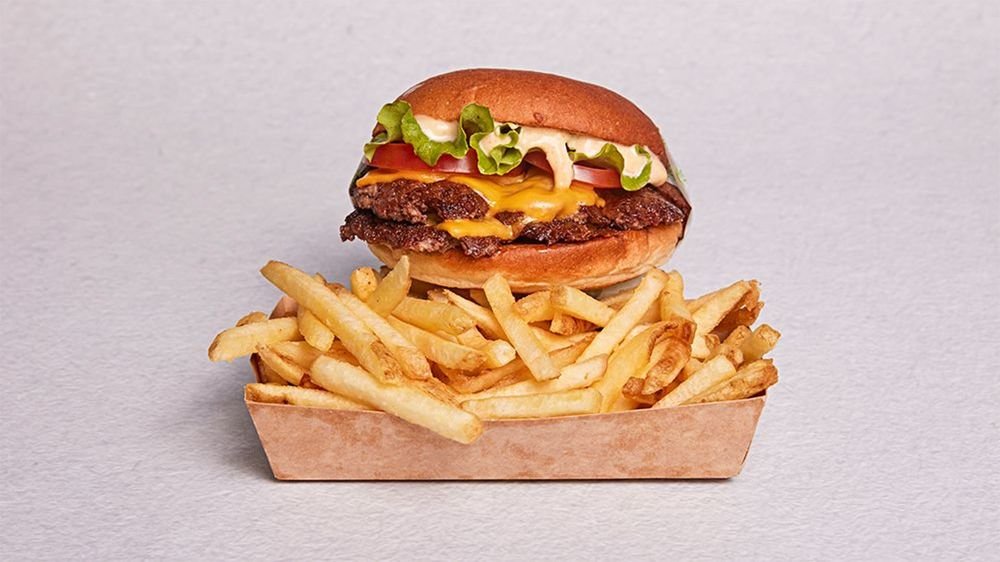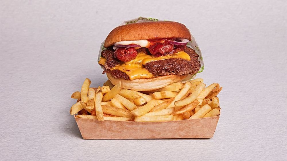 Dubbel Cheddarost, majonnäs, ketchup, senap, hackad silverlök, pickles Obs - endast burgaren.