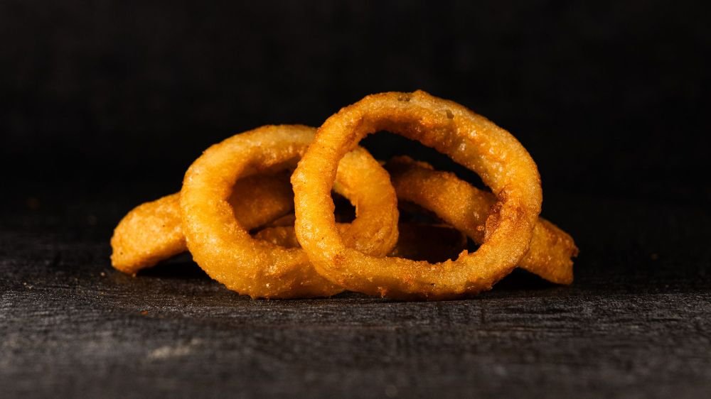 3 stycken friterade beer battered lökringar.