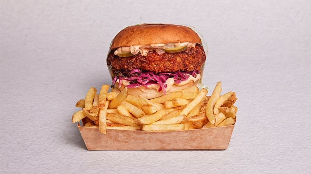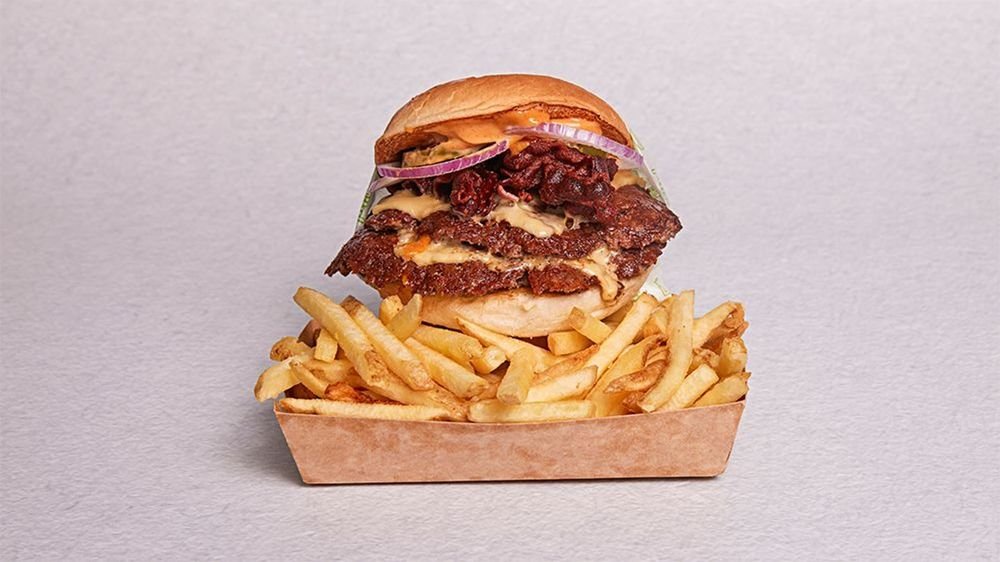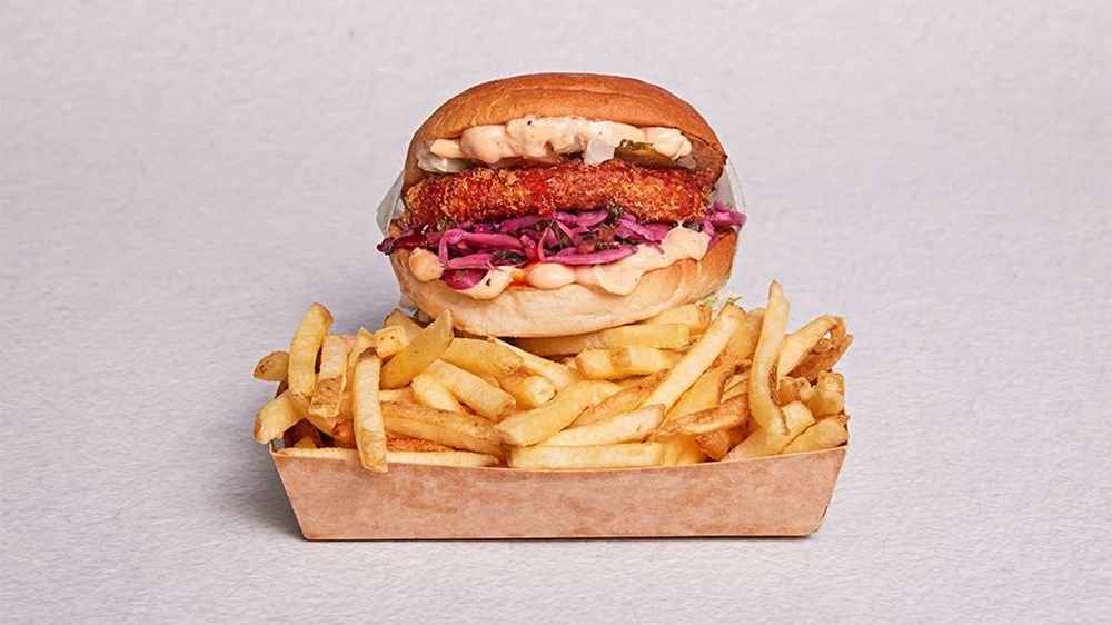 Panerad, friterad Tempeh, Comebacksauce, Hotsauce, pickle slaw, pickles, hackad silverlök. Serveras med Fries.