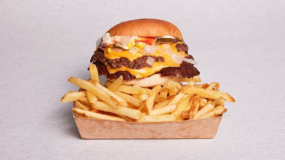 Standard Onion Cheese (Dubbel cheddar, stekt lök). Serveras med Fries.