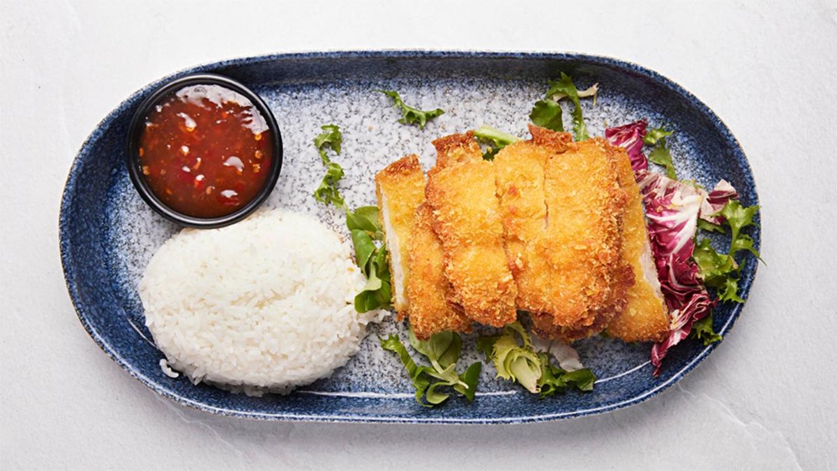 Friterad kyckling, tempura räkor, vegetariska vårrullar, kyckling karaage