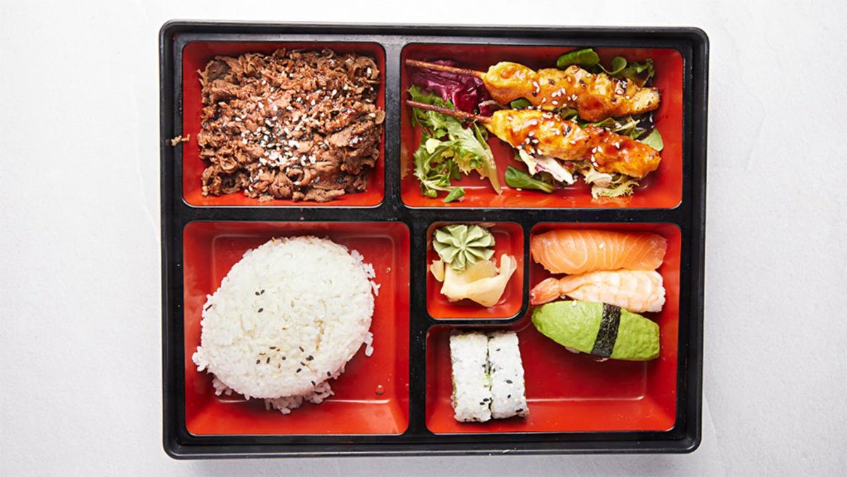 2 nigiri, 2 rullar. yakiniku och yakitori spett & ris