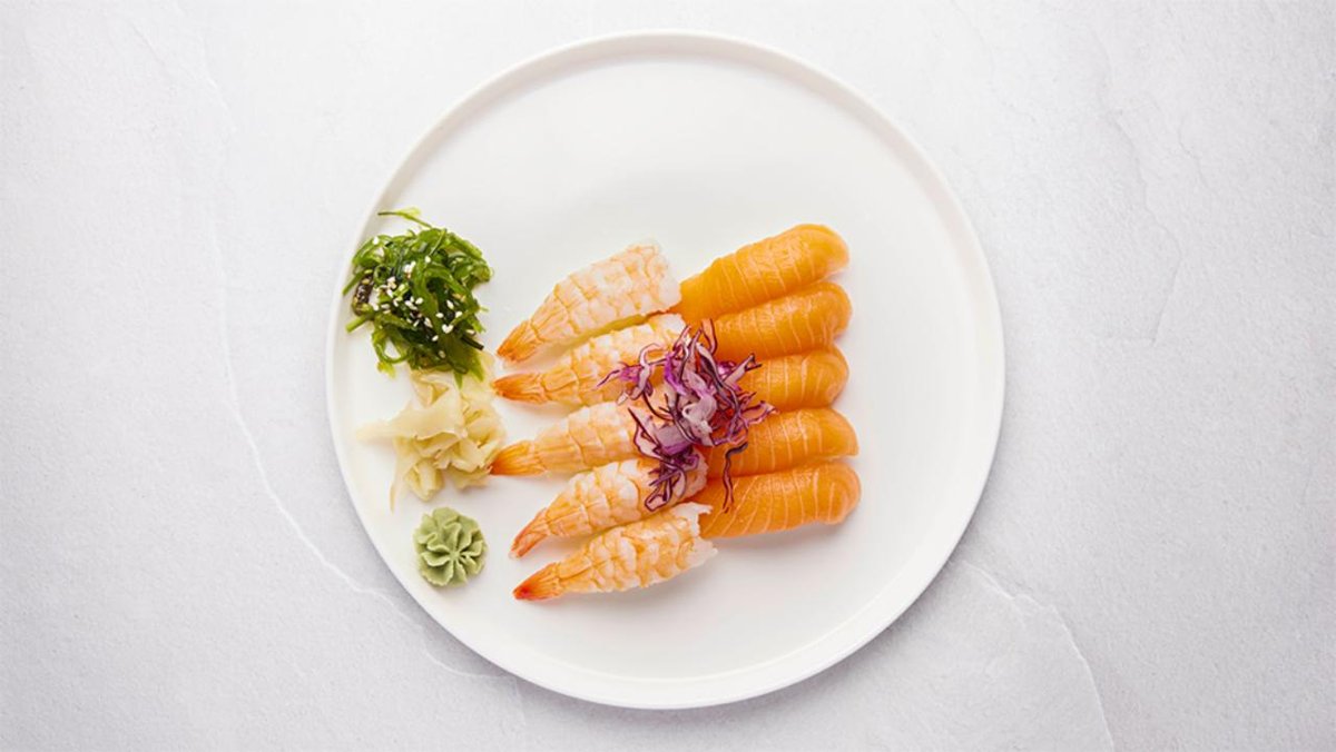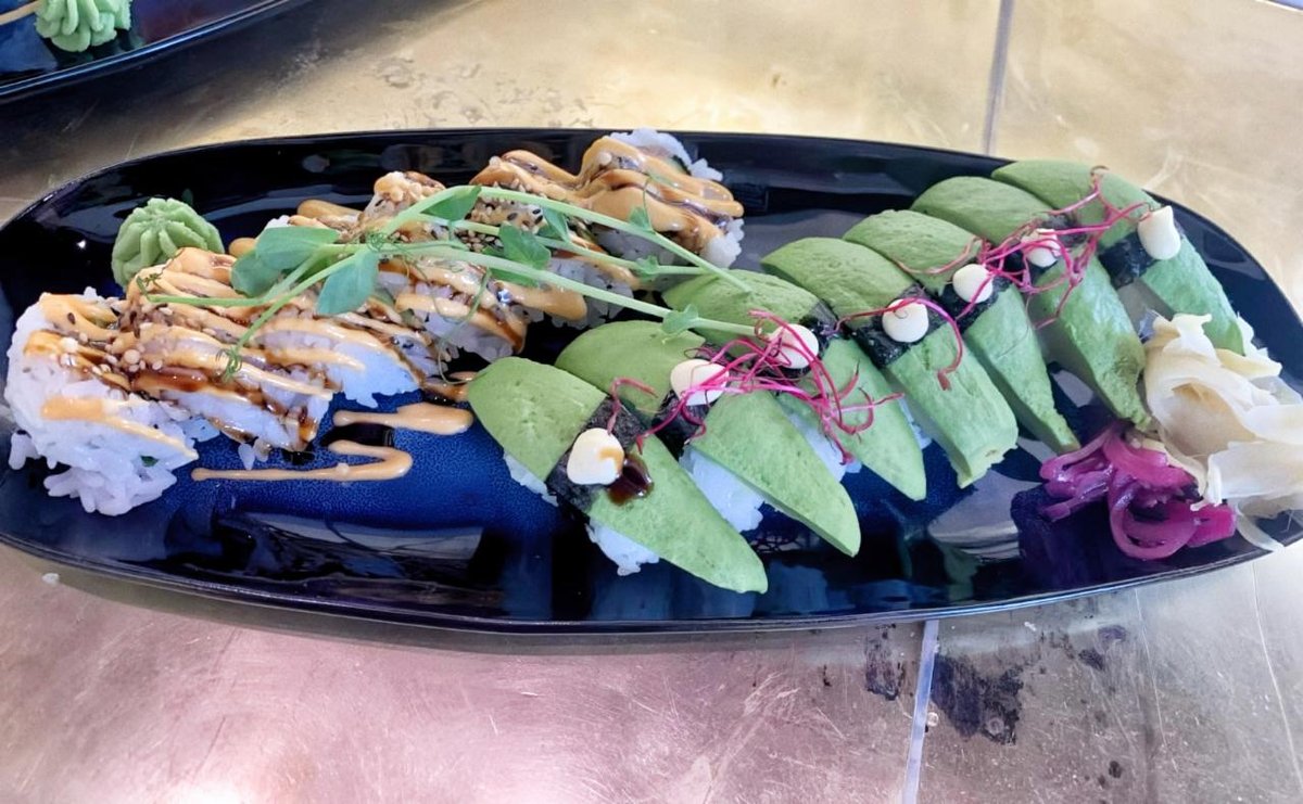 Friteriad räkor philadelphia ost, gurka ,avokado toppad med halstrad lax,avokado rostadlök chilimajo , ål sås och gräslök