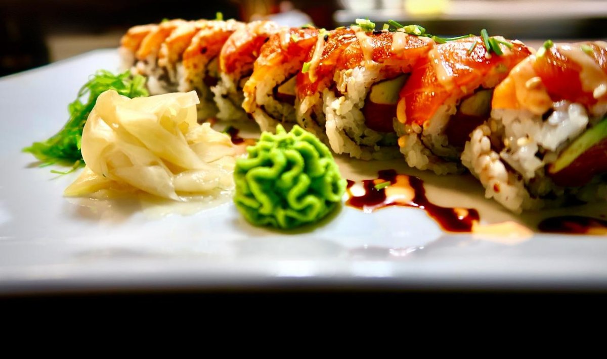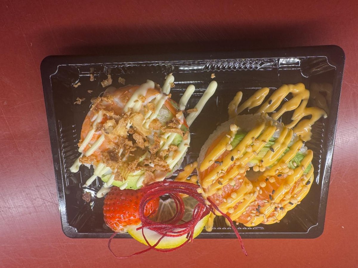 (friterade tiger räkor, lax, gurka, avakoda toppad med chili majo, ål sås och salsa sås