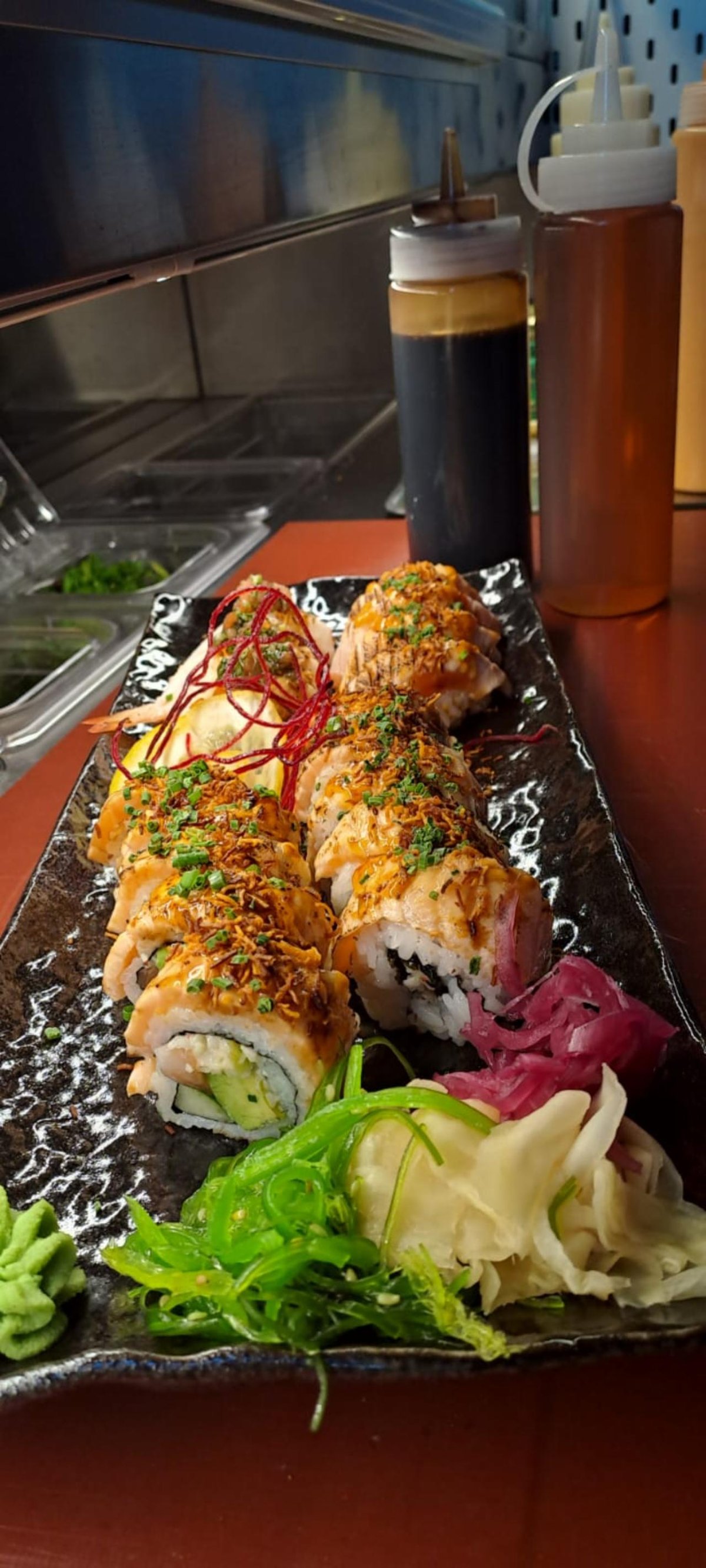 Friterad roll med Lax gurka avokado crabstick, toppad med ålsås chilimayo rostad lök