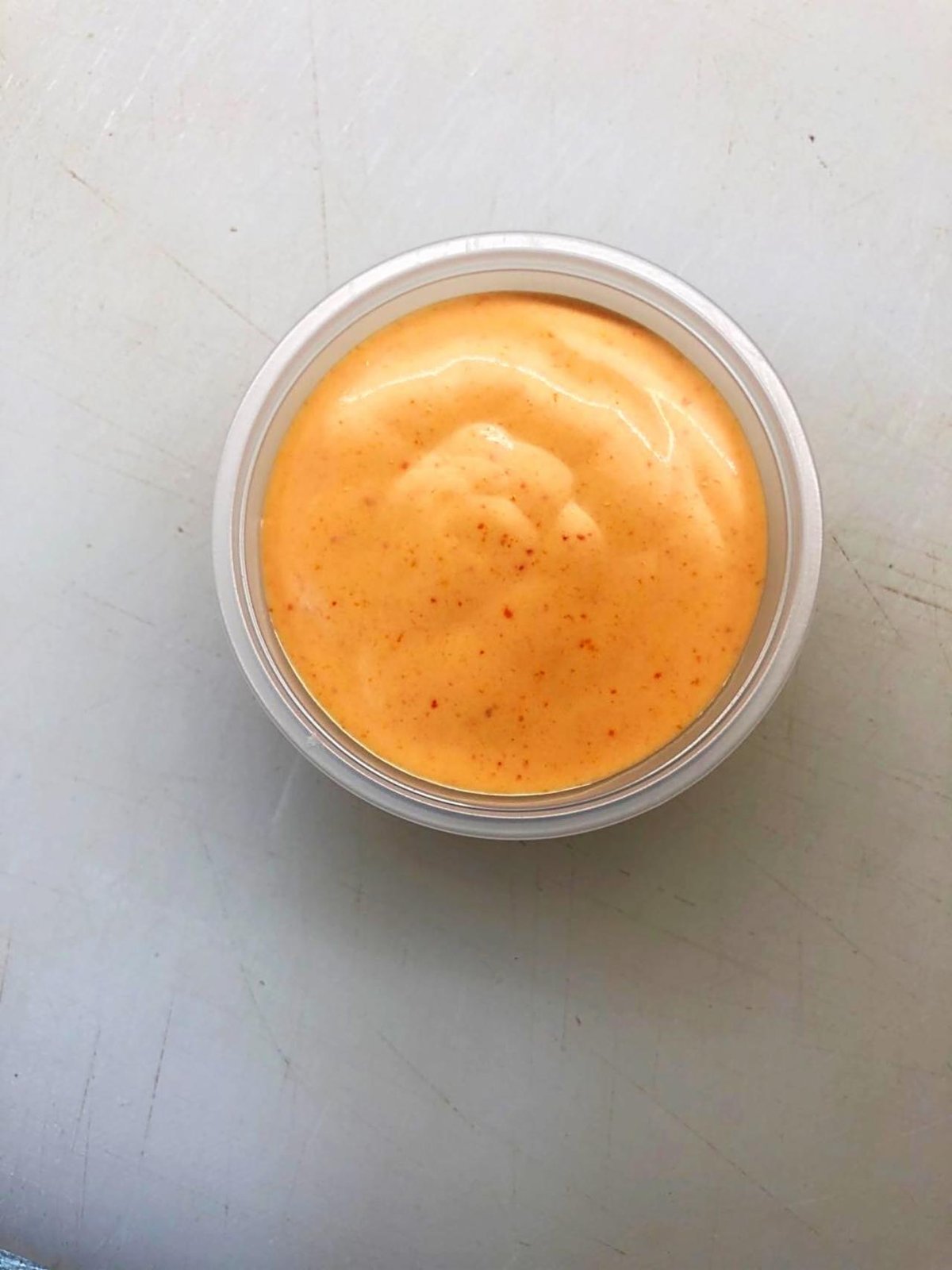 Friterad kyckling ,avokado gurka .toppad med sesamfrön ål sås chips Chilimayo rostad lök