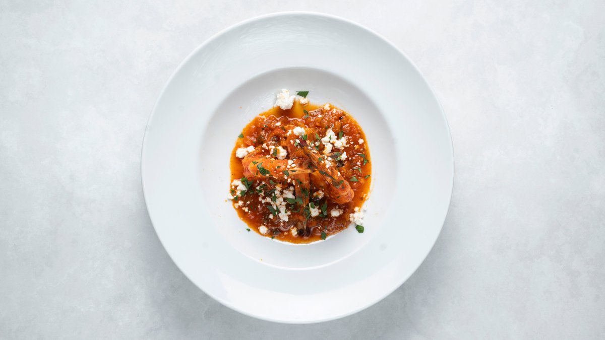 Tigerräkor i en rik tomatsås med chili, vitlök och fetaost