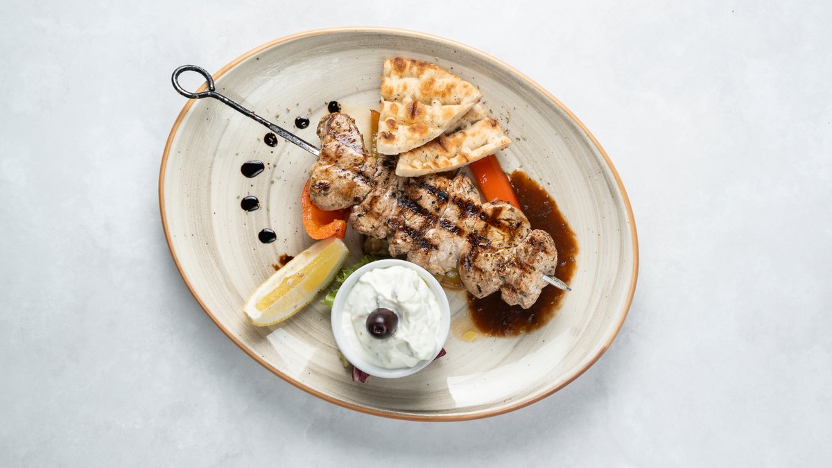 Grillad majskycklingfilé på spett med tzatziki och pitabröd.