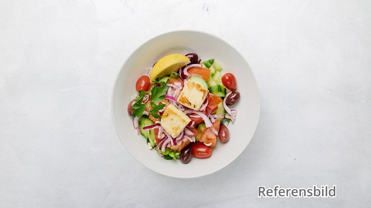 Grekisk sallad med fetaost, coktailtomater, gurka, lök, paprika, oliver, gurka, olivolja