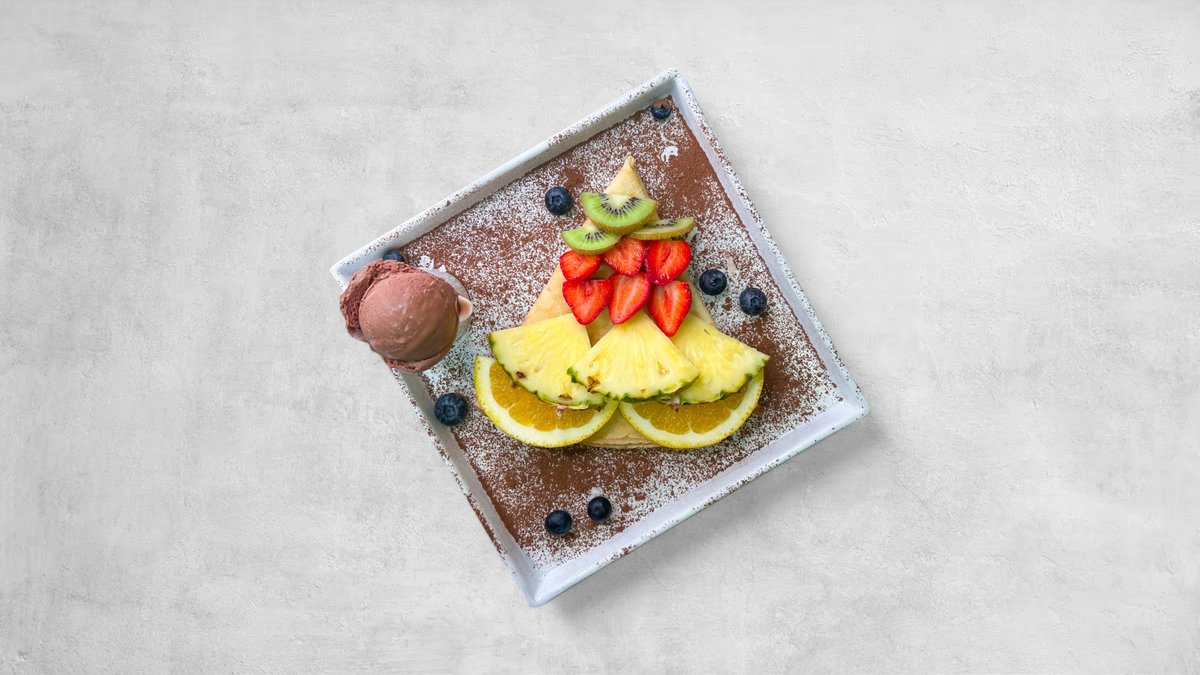 Fransk crêpe med chokladkräm, apelsin, ananas, kiwi, jordgubbar, blåbär, kakao och chokladglas.
