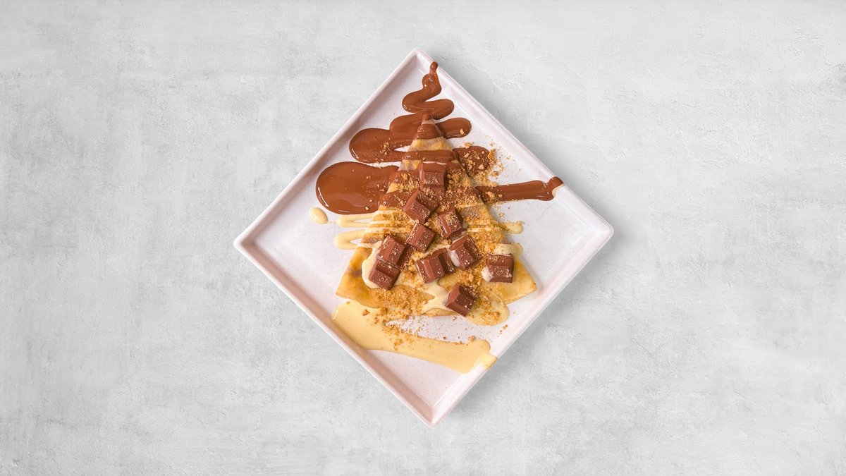 Franska crêpes med kinder, mjölkchoklad, vitchoklad och smulat kex.