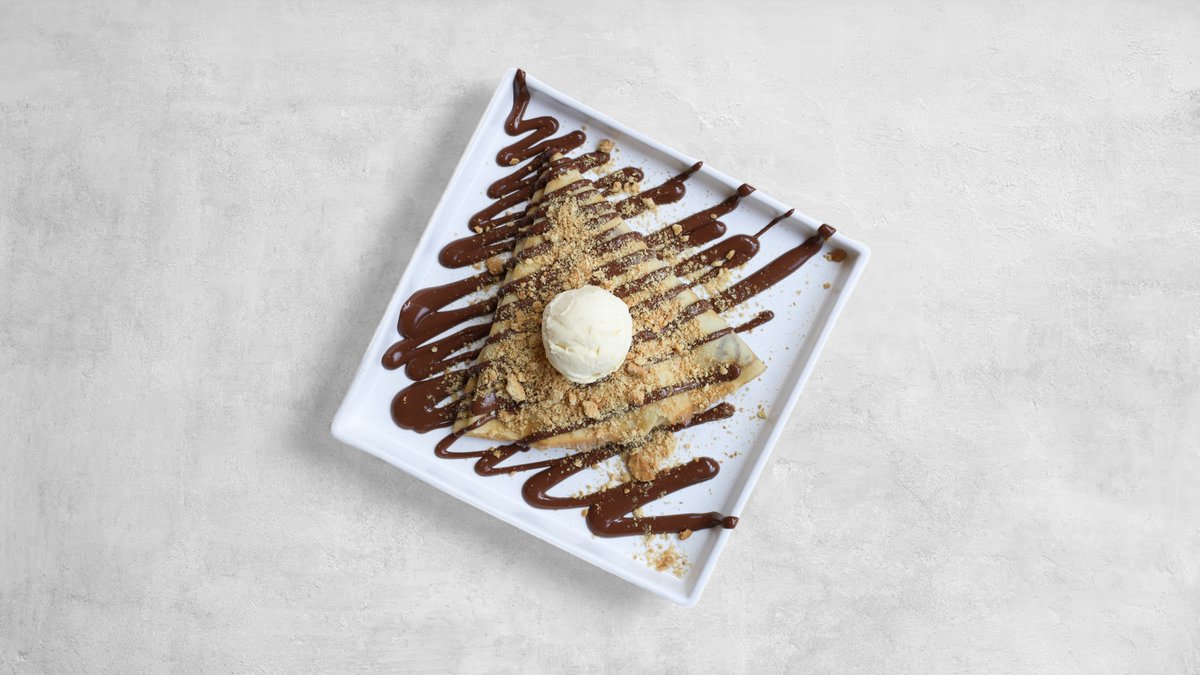 Fransk crêpe med Nutella, banan, kex och vaniljglass.