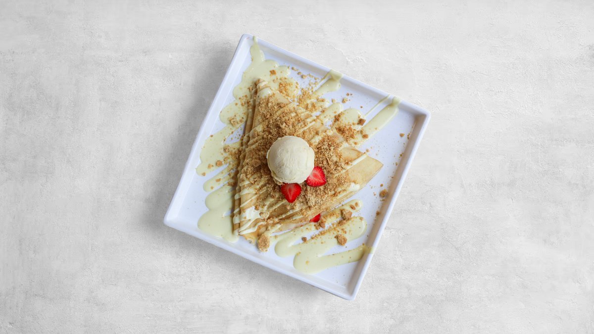 Fransk crêpe med vitchoklad, cheesecake, jordgubbar, kex och vaniljglass.