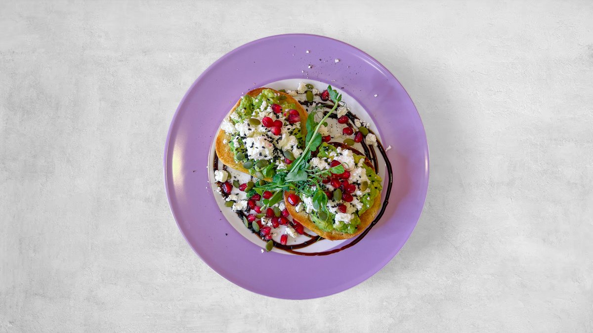 Fluffigt brioche bröd med avokado, fetaost och färsk granatäpplekärnor.