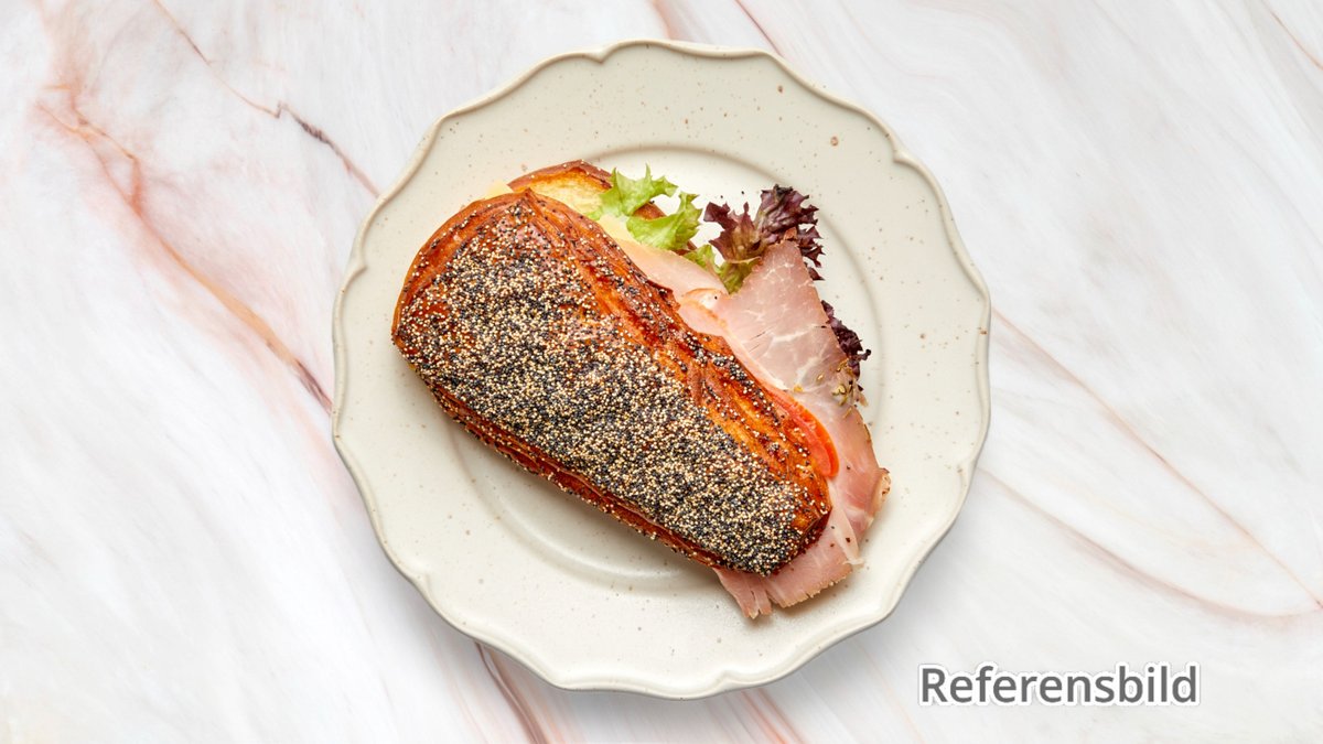 Bröd, skinka, tomat, gurka, ostskiva och isbergssallad.