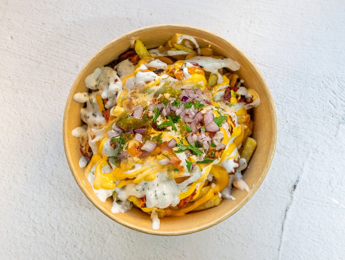 Kycklingbitar, friterade pommes, cheddarost, jalapeños och lök.