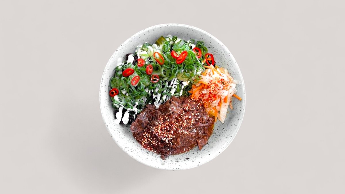 Högrev (Naturbetat, Svartådalen) , svartris, gurka, chili, aioli, honung, grönkål och vårlök. Innehåller: soja, sesam, kimchi och fisksås.