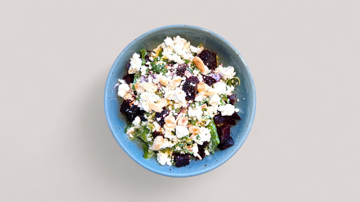 Chevre, tryffel, rödbetor, morot, quinoa, spenat, grönkål, lönnsirap och mandel.