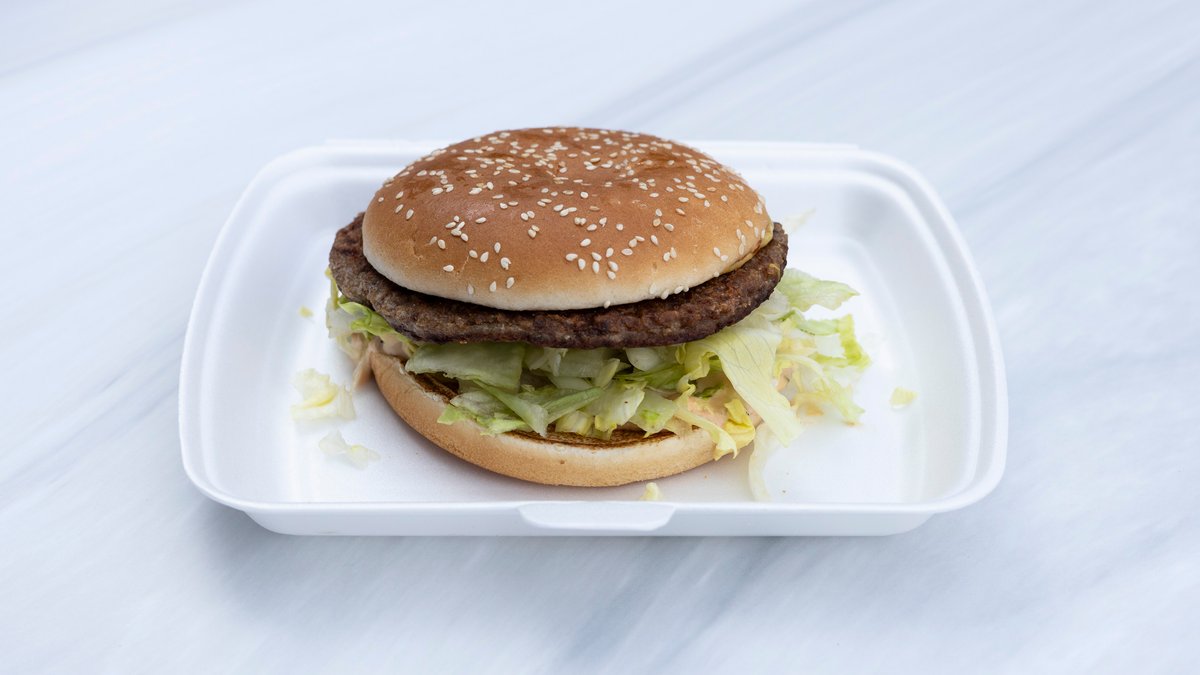 Med hemlagat potatismos, sallad, rå lök, rostad lök, senap och ketchup.