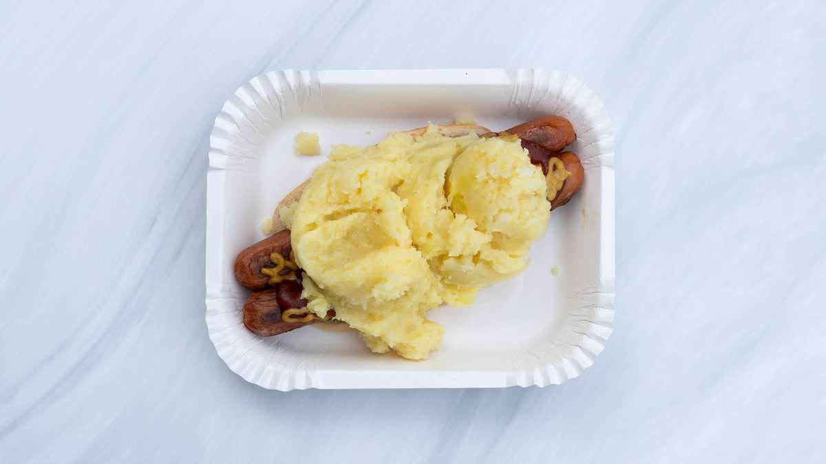 Med hemlagat potatismos och valfri tjockkorv, sallad, rå lök, rostad lök, senap och ketchup.