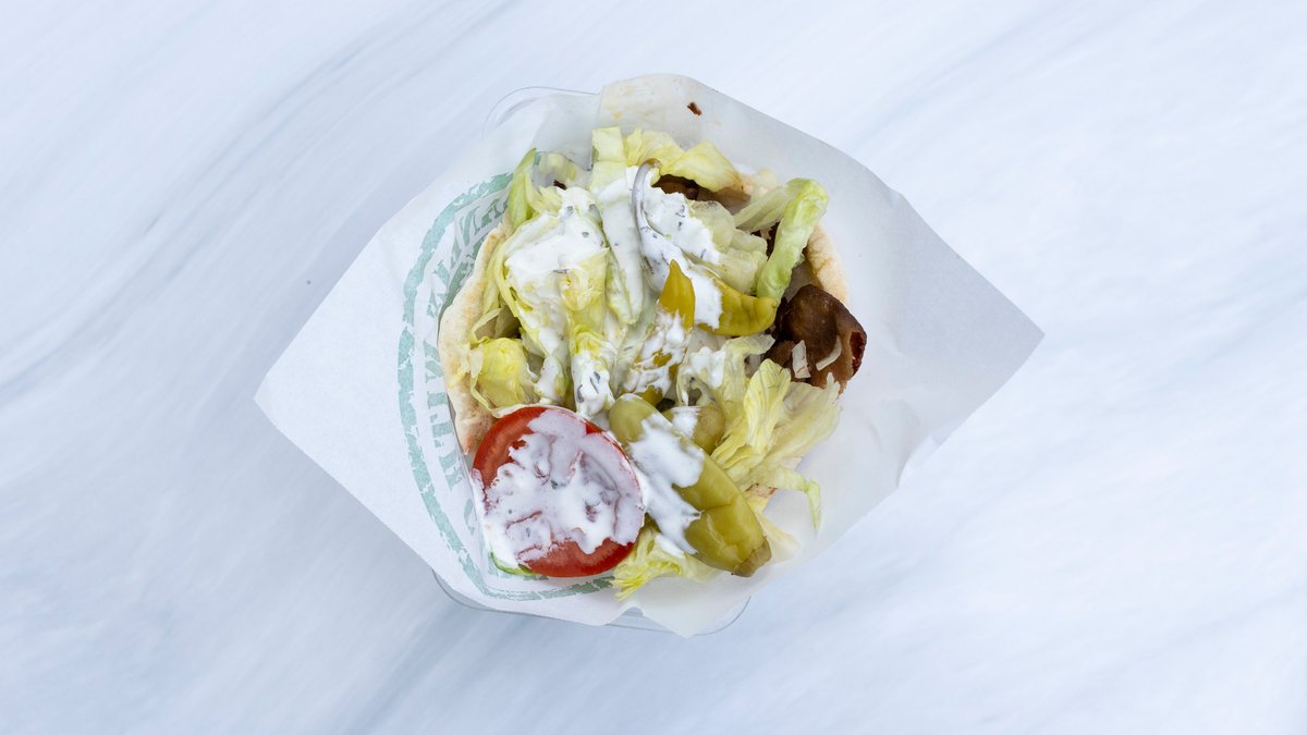 Sallad, lök, tomat, pepperoni, tomat och vitlökssås.