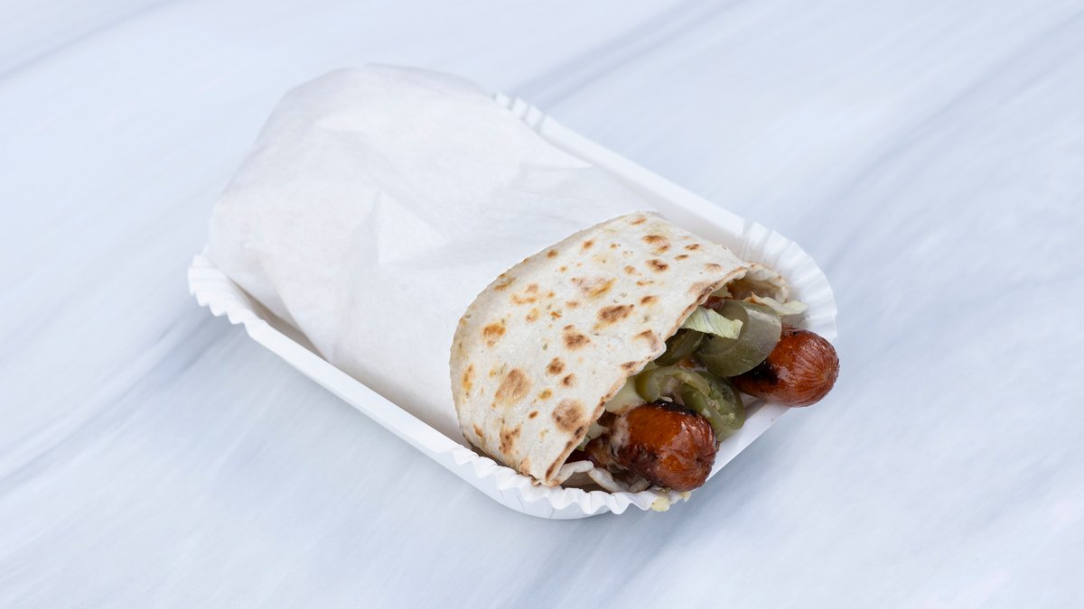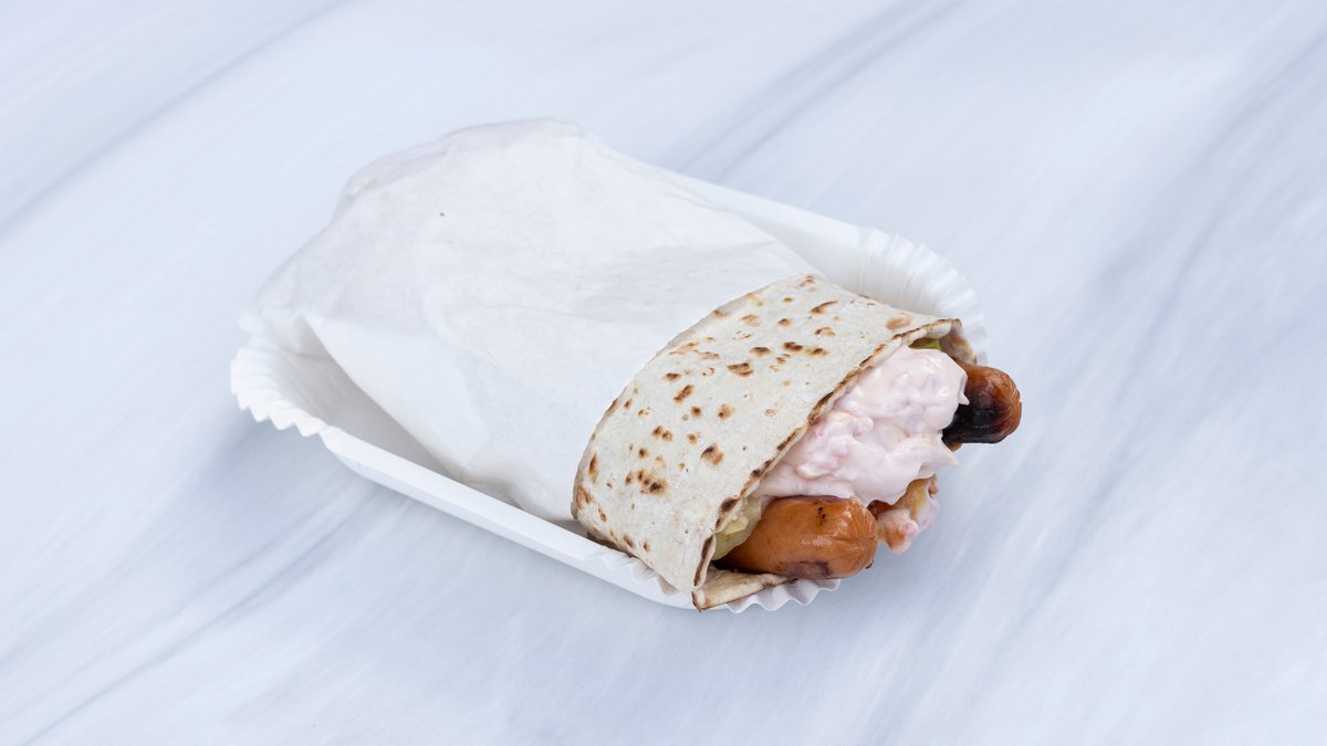 Tunnbrödsrulle med grillkorv, Jannes berömda kiosklagade mos, skagenröra, sallad, picklad röd lök, rostad lök och Johnnys sötstarka senap.