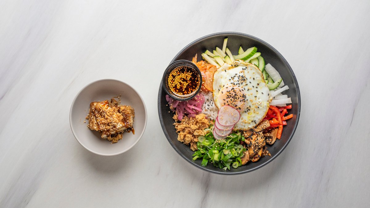 Inlagda böngroddar, sjögrässallad, kimchi (inlagd kinakål), sojabönor, inlagd svampsallad, marinerad tomatsallad med färsk ingefära, tofu, avokado och stekt ägg. Serveras på risbäd.