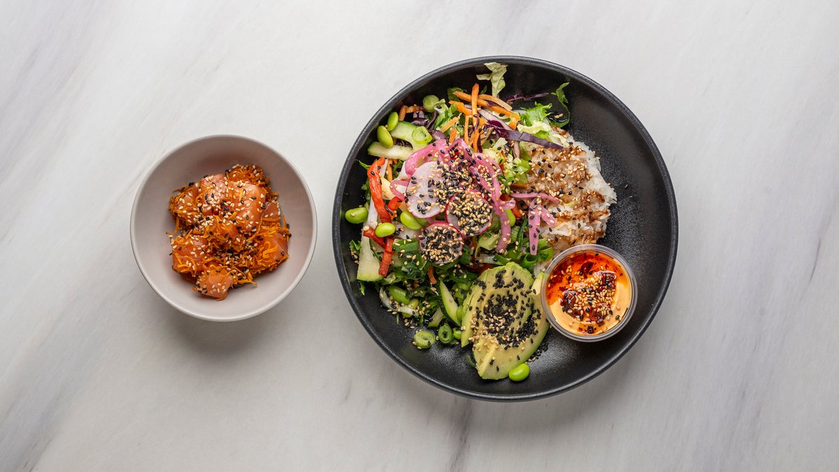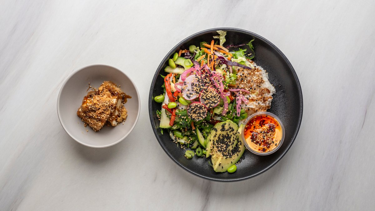 Risbädden toppas med grillad ålfilé, bläckfisksallad, sushi ingefära, sjögrässallad, sojabönor, avokado, fiskrom, marinerad tomatsallad med färsk ingefära, gurkor, sesamfrön och ålsås.