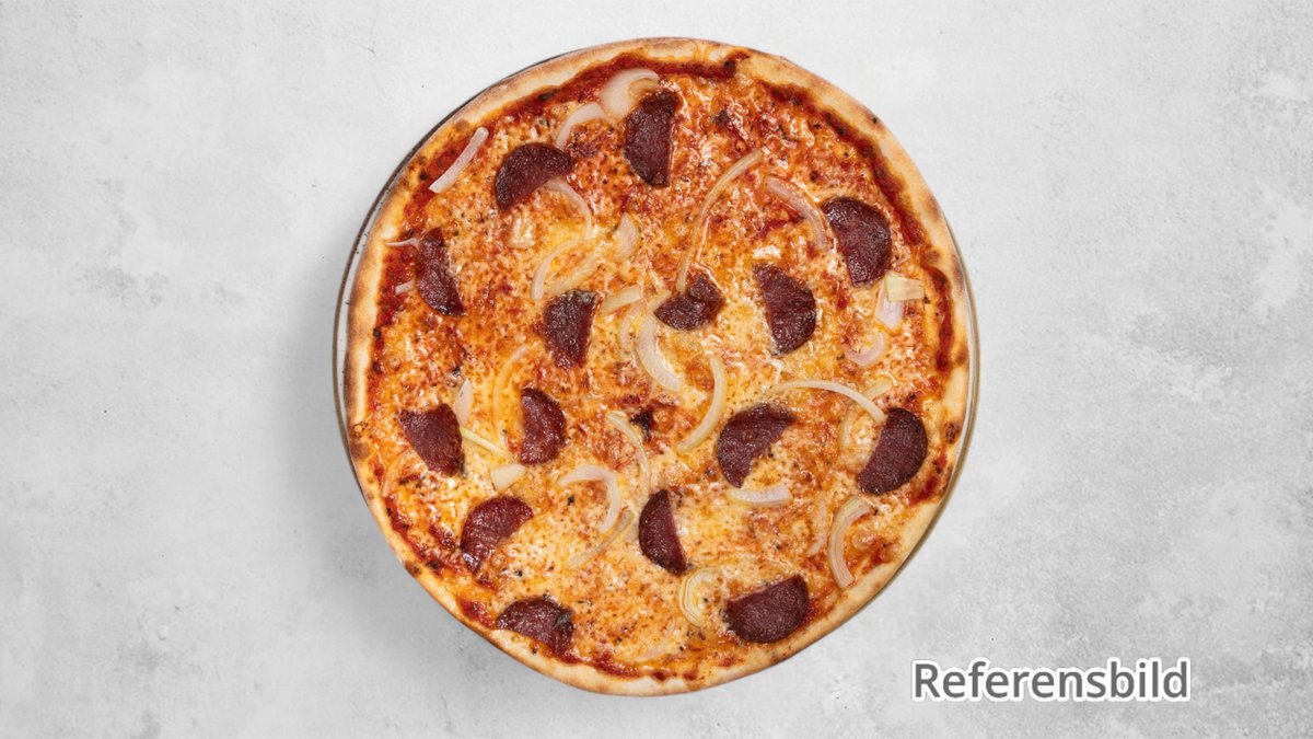 Tomatsås, ost, fetaost, salami, lök, paprika.