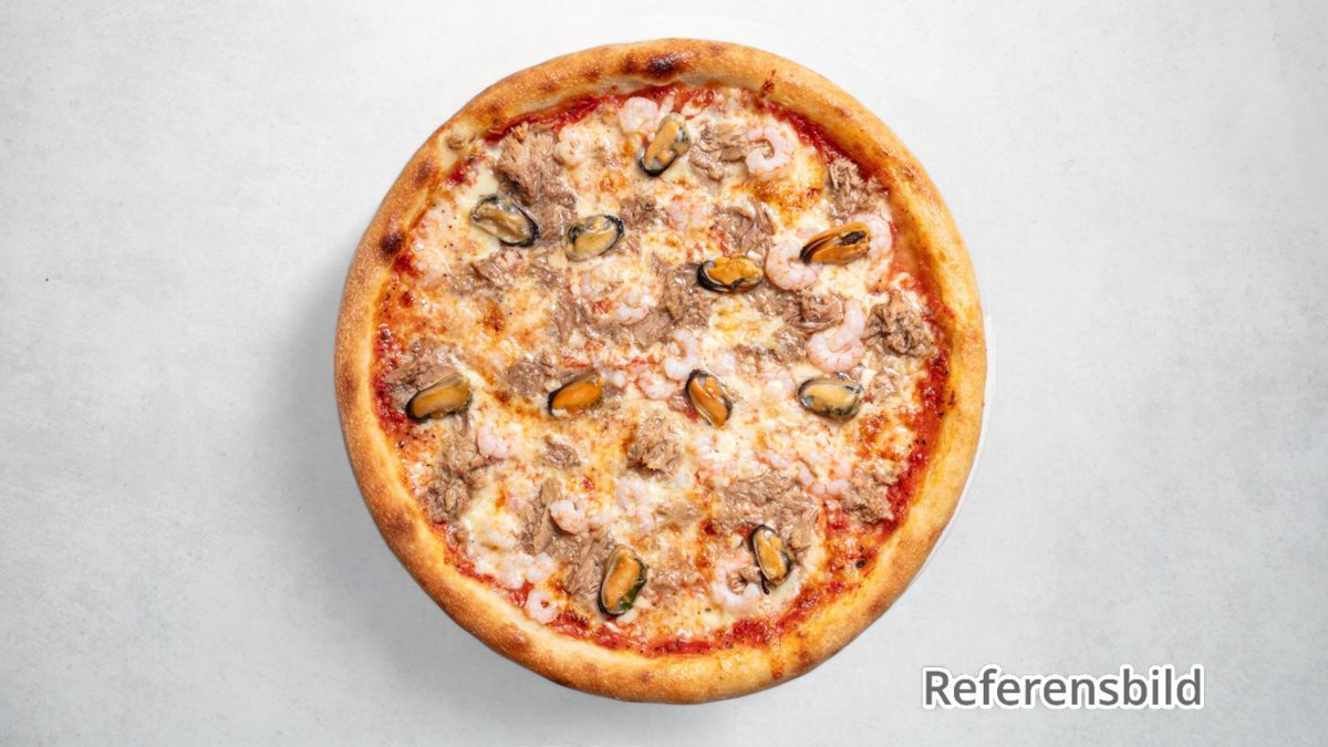Tomatsås, ost, räkor, tonfisk, musslor.