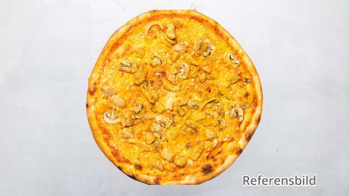 Tomatsås, ost, skinka, champinjoner. (inbakad)