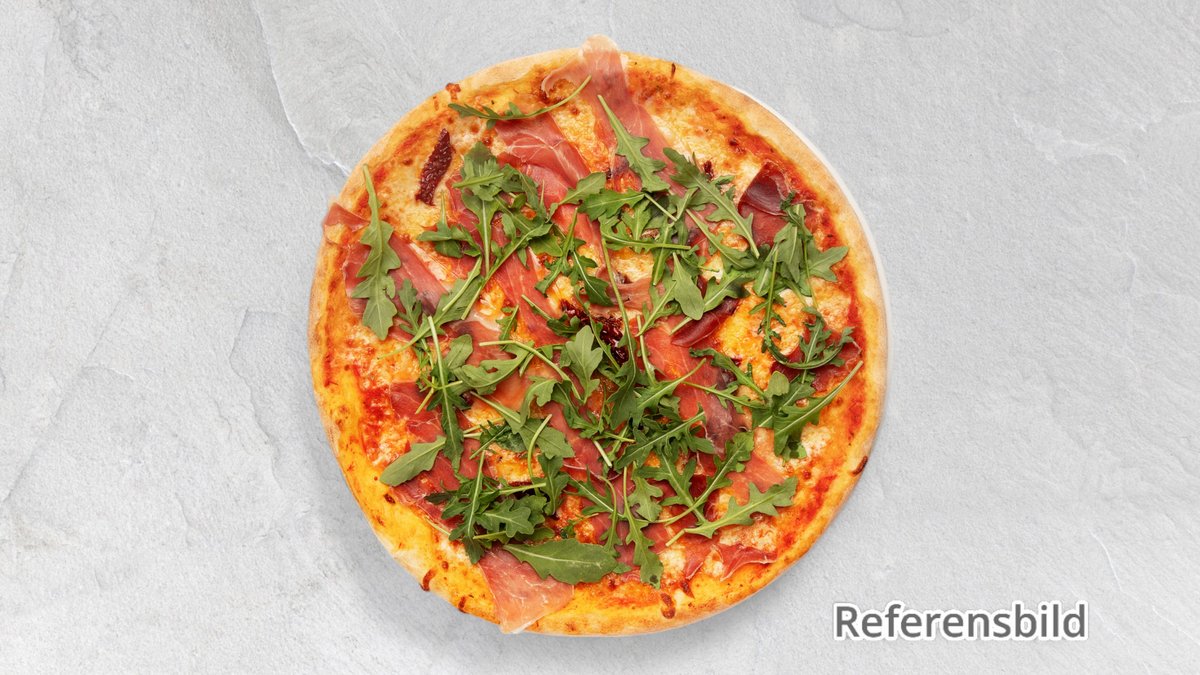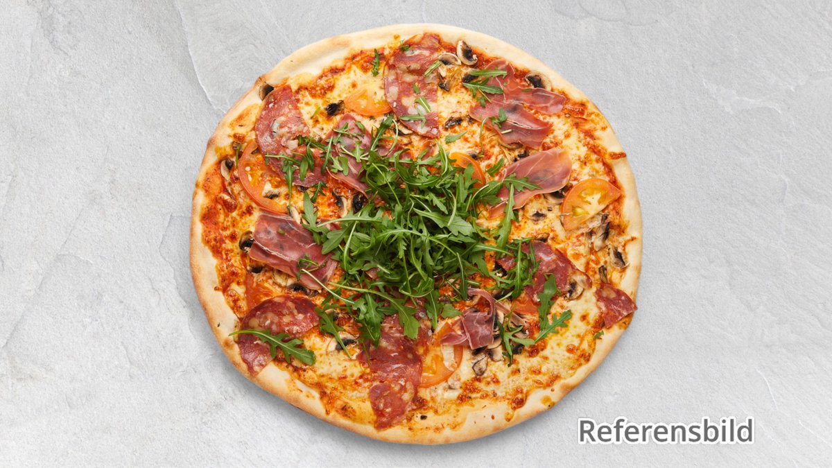 Tomatsås, ost, skinka, räkor och champinjoner.