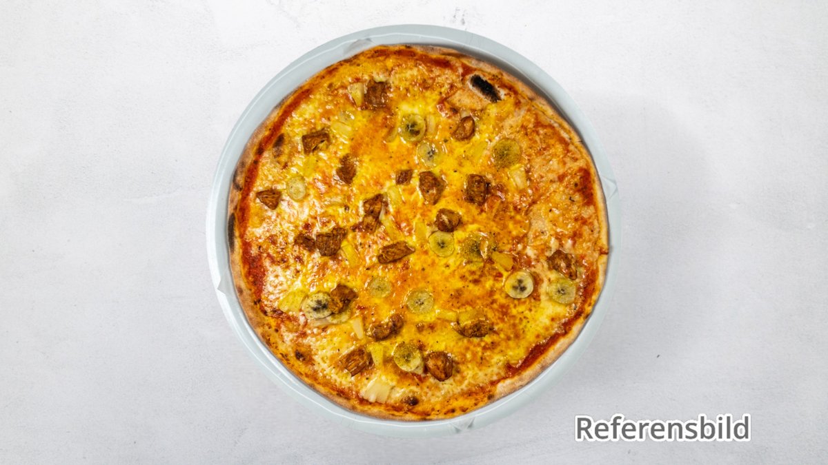 Tomatsås, ost, skinka, ananas, banan, curry.