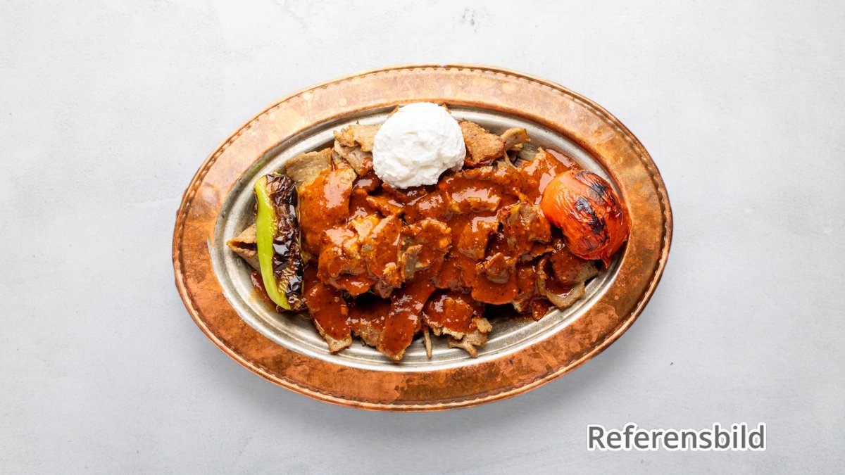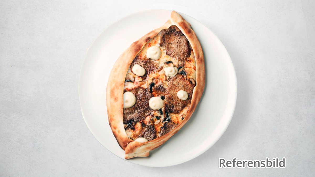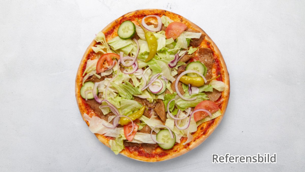 Tomatsås, ost, oxfilé, skinka, lök, fefferoni, bearnaisesås.