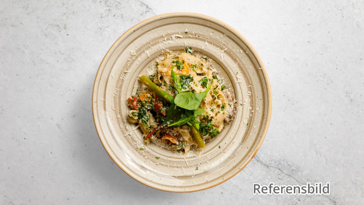 Med Kyckling, f.paprika, lök, pesto, f.vitlök, grädde.